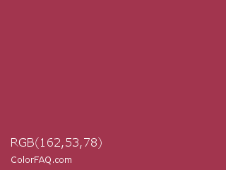 RGB 162,53,78 Color is a normal red color and the nearest color is Night Shadz #aa375a. Hex code #a2354e and RGB value is rgb(162,53,78). In RGB color space, this color is composed of 64% red, 21% green, 31% blue, In CMYK color space, this color is composed of 0% cyan, 67% magenta, 52% yellow , 36% black , In HSL color space, this color has a hue angle of 346° , 51% saturation and 42% lightness.