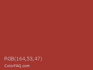 RGB 164,53,47 Color is a normal red color and the nearest color is Sweet Brown #a83731. Hex code #a4352f and RGB value is rgb(164,53,47). In RGB color space, this color is composed of 64% red, 21% green, 18% blue, In CMYK color space, this color is composed of 0% cyan, 68% magenta, 71% yellow , 36% black , In HSL color space, this color has a hue angle of 3° , 55% saturation and 41% lightness.