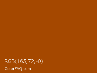 RGB 165,72,-0 Color is a normal orange color and the nearest color is Fire #aa4203. Hex code #a54800 and RGB value is rgb(165,72,-0). In RGB color space, this color is composed of 65% red, 28% green, 0% blue, In CMYK color space, this color is composed of 0% cyan, 56% magenta, 100% yellow , 35% black , In HSL color space, this color has a hue angle of 26° , 100% saturation and 32% lightness.