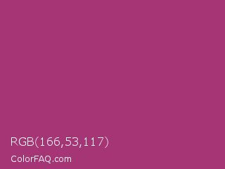 RGB 166,53,117 Color is a normal magenta color and the nearest color is Royal Heath #ab3472. Hex code #a63575 and RGB value is rgb(166,53,117). In RGB color space, this color is composed of 65% red, 21% green, 46% blue, In CMYK color space, this color is composed of 0% cyan, 68% magenta, 30% yellow , 35% black , In HSL color space, this color has a hue angle of 326° , 52% saturation and 43% lightness.