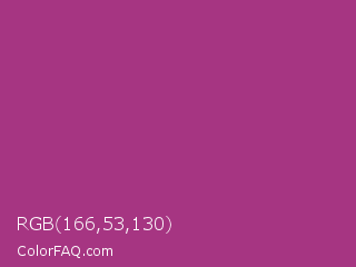 RGB 166,53,130 Color is a normal magenta color and the nearest color is Maximum Red Purple #a63a79. Hex code #a63582 and RGB value is rgb(166,53,130). In RGB color space, this color is composed of 65% red, 21% green, 51% blue, In CMYK color space, this color is composed of 0% cyan, 68% magenta, 22% yellow , 35% black , In HSL color space, this color has a hue angle of 319° , 52% saturation and 43% lightness.