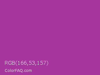 RGB 166,53,157 Color is a normal magenta color and the nearest color is Byzantine #bd33a4. Hex code #a6359d and RGB value is rgb(166,53,157). In RGB color space, this color is composed of 65% red, 21% green, 62% blue, In CMYK color space, this color is composed of 0% cyan, 68% magenta, 5% yellow , 35% black , In HSL color space, this color has a hue angle of 305° , 52% saturation and 43% lightness.