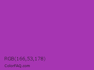RGB 166,53,178 Color is a normal magenta color and the nearest color is Byzantine #bd33a4. Hex code #a635b2 and RGB value is rgb(166,53,178). In RGB color space, this color is composed of 65% red, 21% green, 70% blue, In CMYK color space, this color is composed of 7% cyan, 70% magenta, 0% yellow , 30% black , In HSL color space, this color has a hue angle of 294° , 54% saturation and 45% lightness.