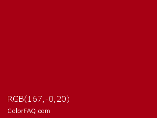 RGB 167,-0,20 Color is a normal red color and the nearest color is Carmine #960018. Hex code #a70014 and RGB value is rgb(167,-0,20). In RGB color space, this color is composed of 65% red, 0% green, 8% blue, In CMYK color space, this color is composed of 0% cyan, 100% magenta, 88% yellow , 35% black , In HSL color space, this color has a hue angle of 353° , 100% saturation and 33% lightness.