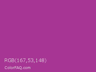 RGB 167,53,148 Color is a normal magenta color and the nearest color is Fandango #b53389. Hex code #a73594 and RGB value is rgb(167,53,148). In RGB color space, this color is composed of 65% red, 21% green, 58% blue, In CMYK color space, this color is composed of 0% cyan, 68% magenta, 11% yellow , 35% black , In HSL color space, this color has a hue angle of 310° , 52% saturation and 43% lightness.