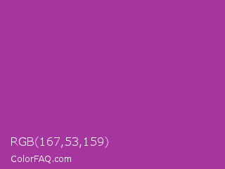 RGB 167,53,159 Color is a normal magenta color and the nearest color is Byzantine #bd33a4. Hex code #a7359f and RGB value is rgb(167,53,159). In RGB color space, this color is composed of 65% red, 21% green, 62% blue, In CMYK color space, this color is composed of 0% cyan, 68% magenta, 5% yellow , 35% black , In HSL color space, this color has a hue angle of 304° , 52% saturation and 43% lightness.