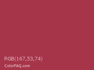RGB 167,53,74 Color is a normal red color and the nearest color is Amaranth Purple #ab274f. Hex code #a7354a and RGB value is rgb(167,53,74). In RGB color space, this color is composed of 65% red, 21% green, 29% blue, In CMYK color space, this color is composed of 0% cyan, 68% magenta, 56% yellow , 35% black , In HSL color space, this color has a hue angle of 349° , 52% saturation and 43% lightness.