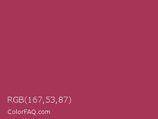 RGB 167,53,87 Color is a normal rose color and the nearest color is Night Shadz #aa375a. Hex code #a73557 and RGB value is rgb(167,53,87). In RGB color space, this color is composed of 65% red, 21% green, 34% blue, In CMYK color space, this color is composed of 0% cyan, 68% magenta, 48% yellow , 35% black , In HSL color space, this color has a hue angle of 342° , 52% saturation and 43% lightness.
