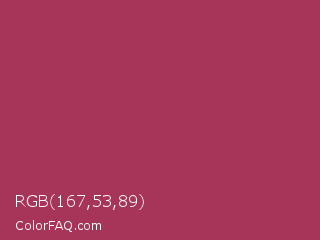 RGB 167,53,89 Color is a normal rose color and the nearest color is Night Shadz #aa375a. Hex code #a73559 and RGB value is rgb(167,53,89). In RGB color space, this color is composed of 65% red, 21% green, 35% blue, In CMYK color space, this color is composed of 0% cyan, 68% magenta, 47% yellow , 35% black , In HSL color space, this color has a hue angle of 341° , 52% saturation and 43% lightness.