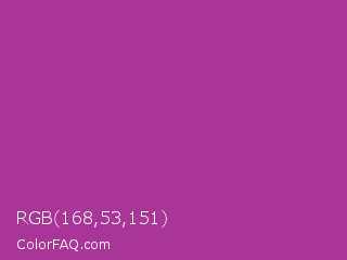 RGB 168,53,151 Color is a normal magenta color and the nearest color is Fandango #b53389. Hex code #a83597 and RGB value is rgb(168,53,151). In RGB color space, this color is composed of 66% red, 21% green, 59% blue, In CMYK color space, this color is composed of 0% cyan, 68% magenta, 10% yellow , 34% black , In HSL color space, this color has a hue angle of 309° , 52% saturation and 43% lightness.