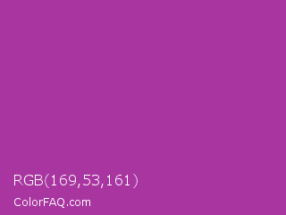 RGB 169,53,161 Color is a normal magenta color and the nearest color is Byzantine #bd33a4. Hex code #a935a1 and RGB value is rgb(169,53,161). In RGB color space, this color is composed of 66% red, 21% green, 63% blue, In CMYK color space, this color is composed of 0% cyan, 69% magenta, 5% yellow , 34% black , In HSL color space, this color has a hue angle of 304° , 52% saturation and 44% lightness.