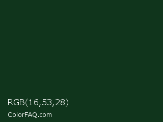 RGB 16,53,28 Color is a very dark green color and the nearest color is Bush #0d2e1c. Hex code #10351c and RGB value is rgb(16,53,28). In RGB color space, this color is composed of 6% red, 21% green, 11% blue, In CMYK color space, this color is composed of 70% cyan, 0% magenta, 47% yellow , 79% black , In HSL color space, this color has a hue angle of 139° , 54% saturation and 14% lightness.