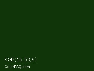 RGB 16,53,9 Color is a very dark green color and the nearest color is Palm Leaf #19330e. Hex code #103509 and RGB value is rgb(16,53,9). In RGB color space, this color is composed of 6% red, 21% green, 4% blue, In CMYK color space, this color is composed of 70% cyan, 0% magenta, 83% yellow , 79% black , In HSL color space, this color has a hue angle of 110° , 71% saturation and 12% lightness.