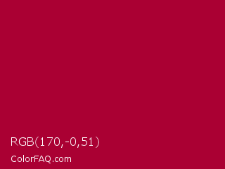 RGB 170,-0,51 Color is a normal rose color and the nearest color is Alabama Crimson #af002a. Hex code #aa0033 and RGB value is rgb(170,-0,51). In RGB color space, this color is composed of 67% red, 0% green, 20% blue, In CMYK color space, this color is composed of 0% cyan, 100% magenta, 70% yellow , 33% black , In HSL color space, this color has a hue angle of 342° , 100% saturation and 33% lightness.