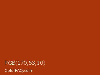 RGB 170,53,10 Color is a normal orange color and the nearest color is Fire #aa4203. Hex code #aa350a and RGB value is rgb(170,53,10). In RGB color space, this color is composed of 67% red, 21% green, 4% blue, In CMYK color space, this color is composed of 0% cyan, 69% magenta, 94% yellow , 33% black , In HSL color space, this color has a hue angle of 16° , 89% saturation and 35% lightness.