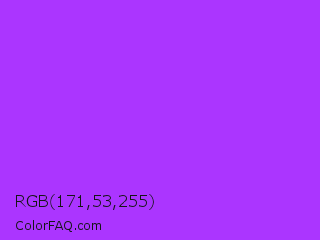 RGB 171,53,255 Color is a normal purple color and the nearest color is Veronica #a020f0. Hex code #ab35ff and RGB value is rgb(171,53,255). In RGB color space, this color is composed of 67% red, 21% green, 100% blue, In CMYK color space, this color is composed of 33% cyan, 79% magenta, 0% yellow , 0% black , In HSL color space, this color has a hue angle of 275° , 100% saturation and 60% lightness.