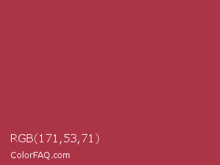 RGB 171,53,71 Color is a normal red color and the nearest color is Amaranth Purple #ab274f. Hex code #ab3547 and RGB value is rgb(171,53,71). In RGB color space, this color is composed of 67% red, 21% green, 28% blue, In CMYK color space, this color is composed of 0% cyan, 69% magenta, 58% yellow , 33% black , In HSL color space, this color has a hue angle of 351° , 53% saturation and 44% lightness.