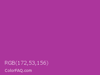 RGB 172,53,156 Color is a normal magenta color and the nearest color is Byzantine #bd33a4. Hex code #ac359c and RGB value is rgb(172,53,156). In RGB color space, this color is composed of 67% red, 21% green, 61% blue, In CMYK color space, this color is composed of 0% cyan, 69% magenta, 9% yellow , 33% black , In HSL color space, this color has a hue angle of 308° , 53% saturation and 44% lightness.