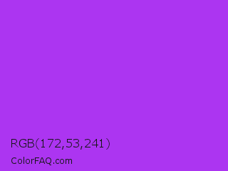 RGB 172,53,241 Color is a normal purple color and the nearest color is Veronica #a020f0. Hex code #ac35f1 and RGB value is rgb(172,53,241). In RGB color space, this color is composed of 67% red, 21% green, 95% blue, In CMYK color space, this color is composed of 29% cyan, 78% magenta, 0% yellow , 5% black , In HSL color space, this color has a hue angle of 278° , 87% saturation and 58% lightness.