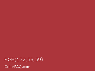 RGB 172,53,59 Color is a normal red color and the nearest color is Sweet Brown #a83731. Hex code #ac353b and RGB value is rgb(172,53,59). In RGB color space, this color is composed of 67% red, 21% green, 23% blue, In CMYK color space, this color is composed of 0% cyan, 69% magenta, 66% yellow , 33% black , In HSL color space, this color has a hue angle of 357° , 53% saturation and 44% lightness.