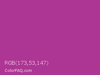 RGB 173,53,147 Color is a normal magenta color and the nearest color is Fandango #b53389. Hex code #ad3593 and RGB value is rgb(173,53,147). In RGB color space, this color is composed of 68% red, 21% green, 58% blue, In CMYK color space, this color is composed of 0% cyan, 69% magenta, 15% yellow , 32% black , In HSL color space, this color has a hue angle of 313° , 53% saturation and 44% lightness.