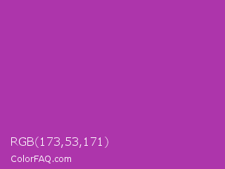 RGB 173,53,171 Color is a normal magenta color and the nearest color is Byzantine #bd33a4. Hex code #ad35ab and RGB value is rgb(173,53,171). In RGB color space, this color is composed of 68% red, 21% green, 67% blue, In CMYK color space, this color is composed of 0% cyan, 69% magenta, 1% yellow , 32% black , In HSL color space, this color has a hue angle of 301° , 53% saturation and 44% lightness.
