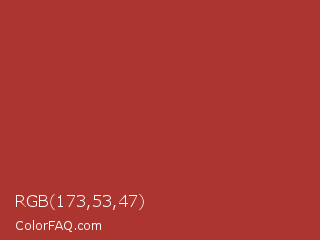 RGB 173,53,47 Color is a normal red color and the nearest color is Sweet Brown #a83731. Hex code #ad352f and RGB value is rgb(173,53,47). In RGB color space, this color is composed of 68% red, 21% green, 18% blue, In CMYK color space, this color is composed of 0% cyan, 69% magenta, 73% yellow , 32% black , In HSL color space, this color has a hue angle of 3° , 57% saturation and 43% lightness.