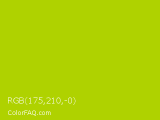 RGB 175,210,-0 Color is a normal yellow color and the nearest color is Vivid Lime Green #a6d608. Hex code #afd200 and RGB value is rgb(175,210,-0). In RGB color space, this color is composed of 69% red, 82% green, 0% blue, In CMYK color space, this color is composed of 17% cyan, 0% magenta, 100% yellow , 18% black , In HSL color space, this color has a hue angle of 70° , 100% saturation and 41% lightness.
