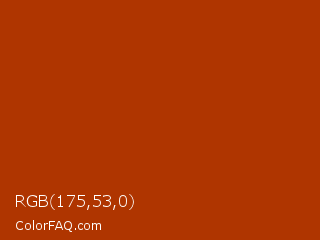 RGB 175,53,0 Color is a normal orange color and the nearest color is Fire #aa4203. Hex code #af3500 and RGB value is rgb(175,53,0). In RGB color space, this color is composed of 69% red, 21% green, 0% blue, In CMYK color space, this color is composed of 0% cyan, 70% magenta, 100% yellow , 31% black , In HSL color space, this color has a hue angle of 18° , 100% saturation and 34% lightness.