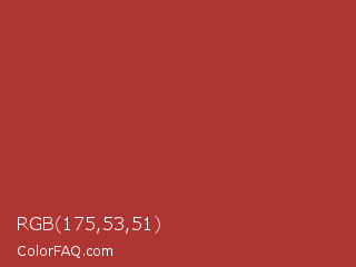 RGB 175,53,51 Color is a normal red color and the nearest color is Well Read #b43332. Hex code #af3533 and RGB value is rgb(175,53,51). In RGB color space, this color is composed of 69% red, 21% green, 20% blue, In CMYK color space, this color is composed of 0% cyan, 70% magenta, 71% yellow , 31% black , In HSL color space, this color has a hue angle of 1° , 55% saturation and 44% lightness.