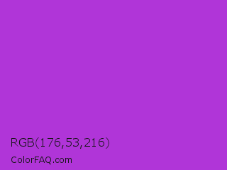 RGB 176,53,216 Color is a normal purple color and the nearest color is Dark Orchid #9932cc. Hex code #b035d8 and RGB value is rgb(176,53,216). In RGB color space, this color is composed of 69% red, 21% green, 85% blue, In CMYK color space, this color is composed of 19% cyan, 75% magenta, 0% yellow , 15% black , In HSL color space, this color has a hue angle of 285° , 68% saturation and 53% lightness.