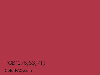 RGB 176,53,71 Color is a normal red color and the nearest color is Amaranth Purple #ab274f. Hex code #b03547 and RGB value is rgb(176,53,71). In RGB color space, this color is composed of 69% red, 21% green, 28% blue, In CMYK color space, this color is composed of 0% cyan, 70% magenta, 60% yellow , 31% black , In HSL color space, this color has a hue angle of 351° , 54% saturation and 45% lightness.