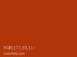RGB 177,53,11 Color is a normal color and the nearest color is Rust #b7410e. Hex code #b1350b and RGB value is rgb(177,53,11). In RGB color space, this color is composed of 69% red, 21% green, 4% blue, In CMYK color space, this color is composed of 0% cyan, 70% magenta, 94% yellow , 31% black , In HSL color space, this color has a hue angle of 15° , 88% saturation and 37% lightness.
