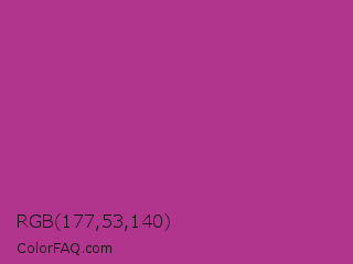 RGB 177,53,140 Color is a normal magenta color and the nearest color is Fandango #b53389. Hex code #b1358c and RGB value is rgb(177,53,140). In RGB color space, this color is composed of 69% red, 21% green, 55% blue, In CMYK color space, this color is composed of 0% cyan, 70% magenta, 21% yellow , 31% black , In HSL color space, this color has a hue angle of 318° , 54% saturation and 45% lightness.