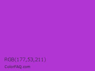 RGB 177,53,211 Color is a normal purple color and the nearest color is Dark Orchid #9932cc. Hex code #b135d3 and RGB value is rgb(177,53,211). In RGB color space, this color is composed of 69% red, 21% green, 83% blue, In CMYK color space, this color is composed of 16% cyan, 75% magenta, 0% yellow , 17% black , In HSL color space, this color has a hue angle of 287° , 64% saturation and 52% lightness.