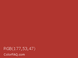 RGB 177,53,47 Color is a normal red color and the nearest color is Well Read #b43332. Hex code #b1352f and RGB value is rgb(177,53,47). In RGB color space, this color is composed of 69% red, 21% green, 18% blue, In CMYK color space, this color is composed of 0% cyan, 70% magenta, 73% yellow , 31% black , In HSL color space, this color has a hue angle of 3° , 58% saturation and 44% lightness.