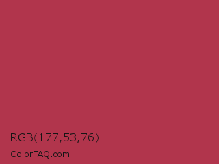 RGB 177,53,76 Color is a normal red color and the nearest color is Amaranth Purple #ab274f. Hex code #b1354c and RGB value is rgb(177,53,76). In RGB color space, this color is composed of 69% red, 21% green, 30% blue, In CMYK color space, this color is composed of 0% cyan, 70% magenta, 57% yellow , 31% black , In HSL color space, this color has a hue angle of 349° , 54% saturation and 45% lightness.