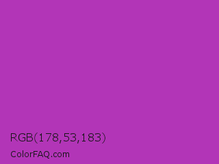 RGB 178,53,183 Color is a normal magenta color and the nearest color is Byzantine #bd33a4. Hex code #b235b7 and RGB value is rgb(178,53,183). In RGB color space, this color is composed of 70% red, 21% green, 72% blue, In CMYK color space, this color is composed of 3% cyan, 71% magenta, 0% yellow , 28% black , In HSL color space, this color has a hue angle of 298° , 55% saturation and 46% lightness.