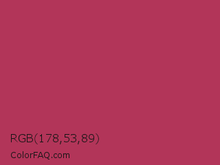RGB 178,53,89 Color is a normal rose color and the nearest color is Night Shadz #aa375a. Hex code #b23559 and RGB value is rgb(178,53,89). In RGB color space, this color is composed of 70% red, 21% green, 35% blue, In CMYK color space, this color is composed of 0% cyan, 70% magenta, 50% yellow , 30% black , In HSL color space, this color has a hue angle of 343° , 54% saturation and 45% lightness.