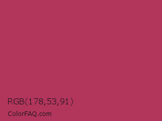 RGB 178,53,91 Color is a normal rose color and the nearest color is Rich Maroon #b03060. Hex code #b2355b and RGB value is rgb(178,53,91). In RGB color space, this color is composed of 70% red, 21% green, 36% blue, In CMYK color space, this color is composed of 0% cyan, 70% magenta, 49% yellow , 30% black , In HSL color space, this color has a hue angle of 342° , 54% saturation and 45% lightness.