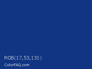 RGB 17,53,131 Color is a dark blue color and the nearest color is Dark Cerulean #08457e. Hex code #113583 and RGB value is rgb(17,53,131). In RGB color space, this color is composed of 7% red, 21% green, 51% blue, In CMYK color space, this color is composed of 87% cyan, 60% magenta, 0% yellow , 49% black , In HSL color space, this color has a hue angle of 221° , 77% saturation and 29% lightness.