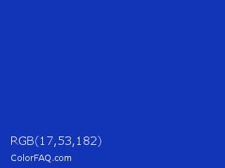 RGB 17,53,182 Color is a normal blue color and the nearest color is Persian Blue #1c39bb. Hex code #1135b6 and RGB value is rgb(17,53,182). In RGB color space, this color is composed of 7% red, 21% green, 71% blue, In CMYK color space, this color is composed of 91% cyan, 71% magenta, 0% yellow , 29% black , In HSL color space, this color has a hue angle of 227° , 83% saturation and 39% lightness.