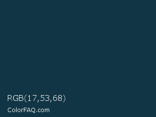 RGB 17,53,68 Color is a very dark blue color and the nearest color is Elephant #123447. Hex code #113544 and RGB value is rgb(17,53,68). In RGB color space, this color is composed of 7% red, 21% green, 27% blue, In CMYK color space, this color is composed of 75% cyan, 22% magenta, 0% yellow , 73% black , In HSL color space, this color has a hue angle of 198° , 60% saturation and 17% lightness.