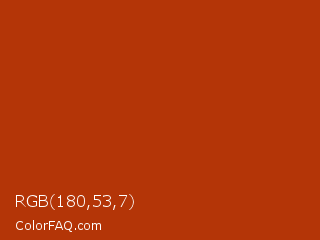 RGB 180,53,7 Color is a normal orange color and the nearest color is Rust #b7410e. Hex code #b43507 and RGB value is rgb(180,53,7). In RGB color space, this color is composed of 71% red, 21% green, 3% blue, In CMYK color space, this color is composed of 0% cyan, 71% magenta, 96% yellow , 29% black , In HSL color space, this color has a hue angle of 16° , 93% saturation and 37% lightness.
