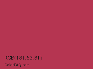 RGB 181,53,81 Color is a normal red color and the nearest color is Night Shadz #aa375a. Hex code #b53551 and RGB value is rgb(181,53,81). In RGB color space, this color is composed of 71% red, 21% green, 32% blue, In CMYK color space, this color is composed of 0% cyan, 71% magenta, 55% yellow , 29% black , In HSL color space, this color has a hue angle of 347° , 55% saturation and 46% lightness.