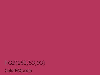RGB 181,53,93 Color is a normal rose color and the nearest color is Rich Maroon #b03060. Hex code #b5355d and RGB value is rgb(181,53,93). In RGB color space, this color is composed of 71% red, 21% green, 36% blue, In CMYK color space, this color is composed of 0% cyan, 71% magenta, 49% yellow , 29% black , In HSL color space, this color has a hue angle of 341° , 55% saturation and 46% lightness.