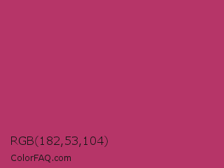 RGB 182,53,104 Color is a normal rose color and the nearest color is Hibiscus #b6316c. Hex code #b63568 and RGB value is rgb(182,53,104). In RGB color space, this color is composed of 71% red, 21% green, 41% blue, In CMYK color space, this color is composed of 0% cyan, 71% magenta, 43% yellow , 29% black , In HSL color space, this color has a hue angle of 336° , 55% saturation and 46% lightness.