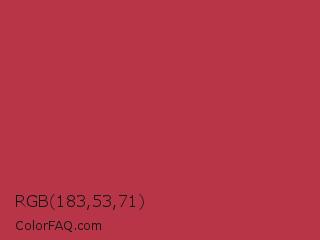 RGB 183,53,71 Color is a normal red color and the nearest color is Dingy Dungeon #c53151. Hex code #b73547 and RGB value is rgb(183,53,71). In RGB color space, this color is composed of 72% red, 21% green, 28% blue, In CMYK color space, this color is composed of 0% cyan, 71% magenta, 61% yellow , 28% black , In HSL color space, this color has a hue angle of 352° , 55% saturation and 46% lightness.