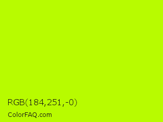 RGB 184,251,-0 Color is a normal lime color and the nearest color is Lime #bfff00. Hex code #b8fb00 and RGB value is rgb(184,251,-0). In RGB color space, this color is composed of 72% red, 98% green, 0% blue, In CMYK color space, this color is composed of 27% cyan, 0% magenta, 100% yellow , 2% black , In HSL color space, this color has a hue angle of 76° , 100% saturation and 49% lightness.