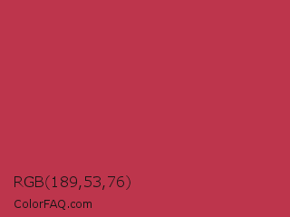 RGB 189,53,76 Color is a normal red color and the nearest color is Dingy Dungeon #c53151. Hex code #bd354c and RGB value is rgb(189,53,76). In RGB color space, this color is composed of 74% red, 21% green, 30% blue, In CMYK color space, this color is composed of 0% cyan, 72% magenta, 60% yellow , 26% black , In HSL color space, this color has a hue angle of 350° , 56% saturation and 47% lightness.